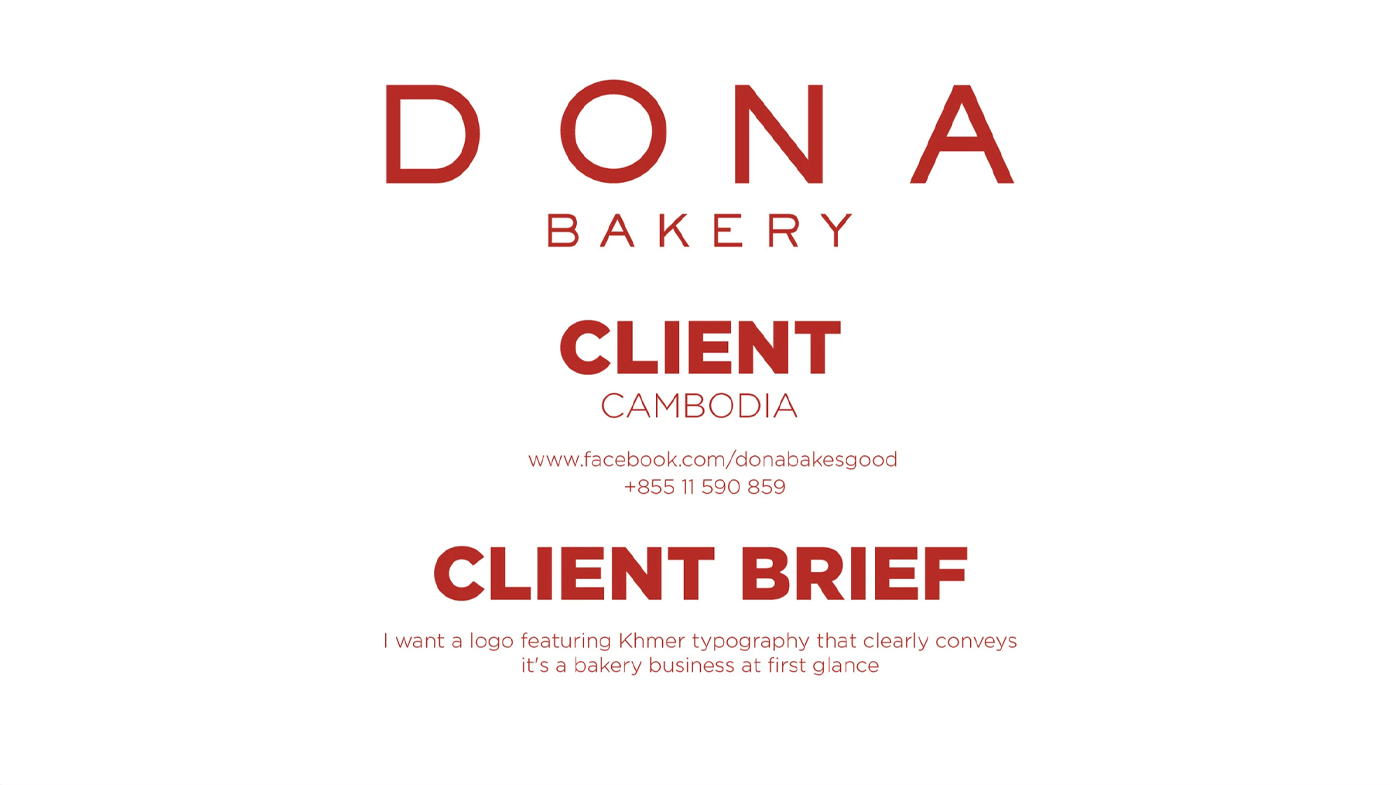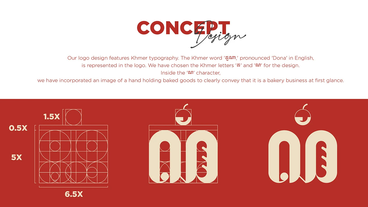 The final DONA Bakery logo blends Cambodian heritage with a modern, professional design. Khmer letters, a baked-goods symbol, and warm colors create a balanced, recognizable, and versatile logo that reflects craftsmanship and hospitality.